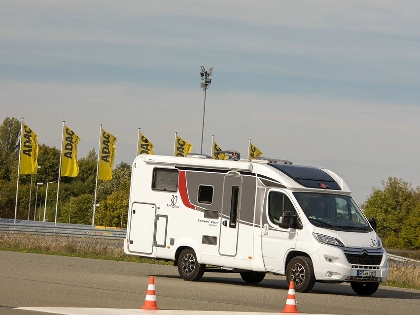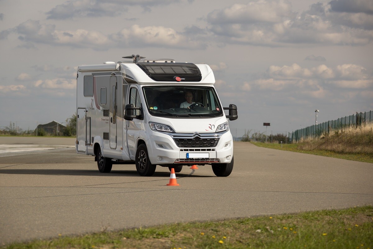 Jetzt geht’s rund. Wir fahren mit Ihnen in die Kreisbahn und schauen, dass Sie richtig in der Spur bleiben. Das gilt natürlich auch für die Kurven, die wir mit Ihnen nehmen. Hier zeigt sich, wie Sie von elektronischen Fahrhilfen, die in nahezu jedem Wohnmobil eingebaut sind, unterstützt werden.