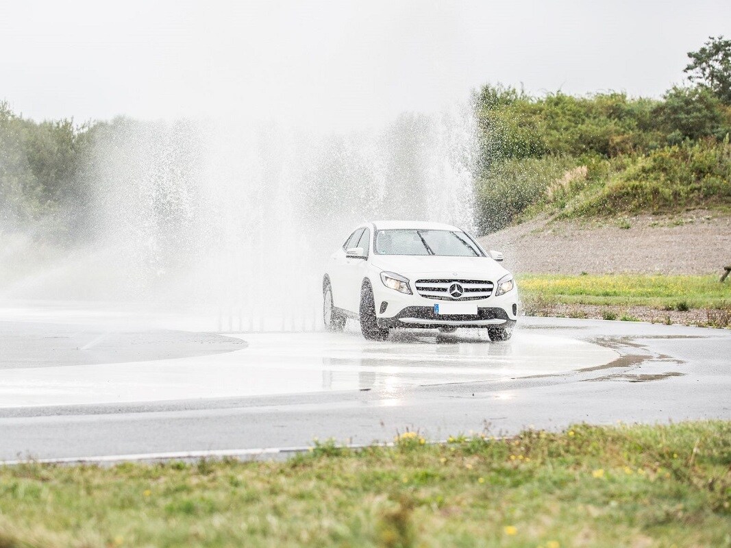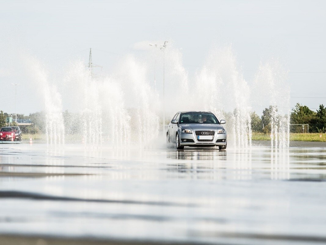 Sie wissen zwar, dass gleich etwas auf Sie zukommt, aber nicht wann und wo. Bei dieser Übung kann Ihr Fahrzeug maximal nass werden, wenn Sie den computergesteuerten Wasserhindernissen nicht rechtzeitig ausweichen. Hier lernen Sie, wie man mit einem gezielten Lenk- und Bremsmanöver dem Hindernis ausweicht.